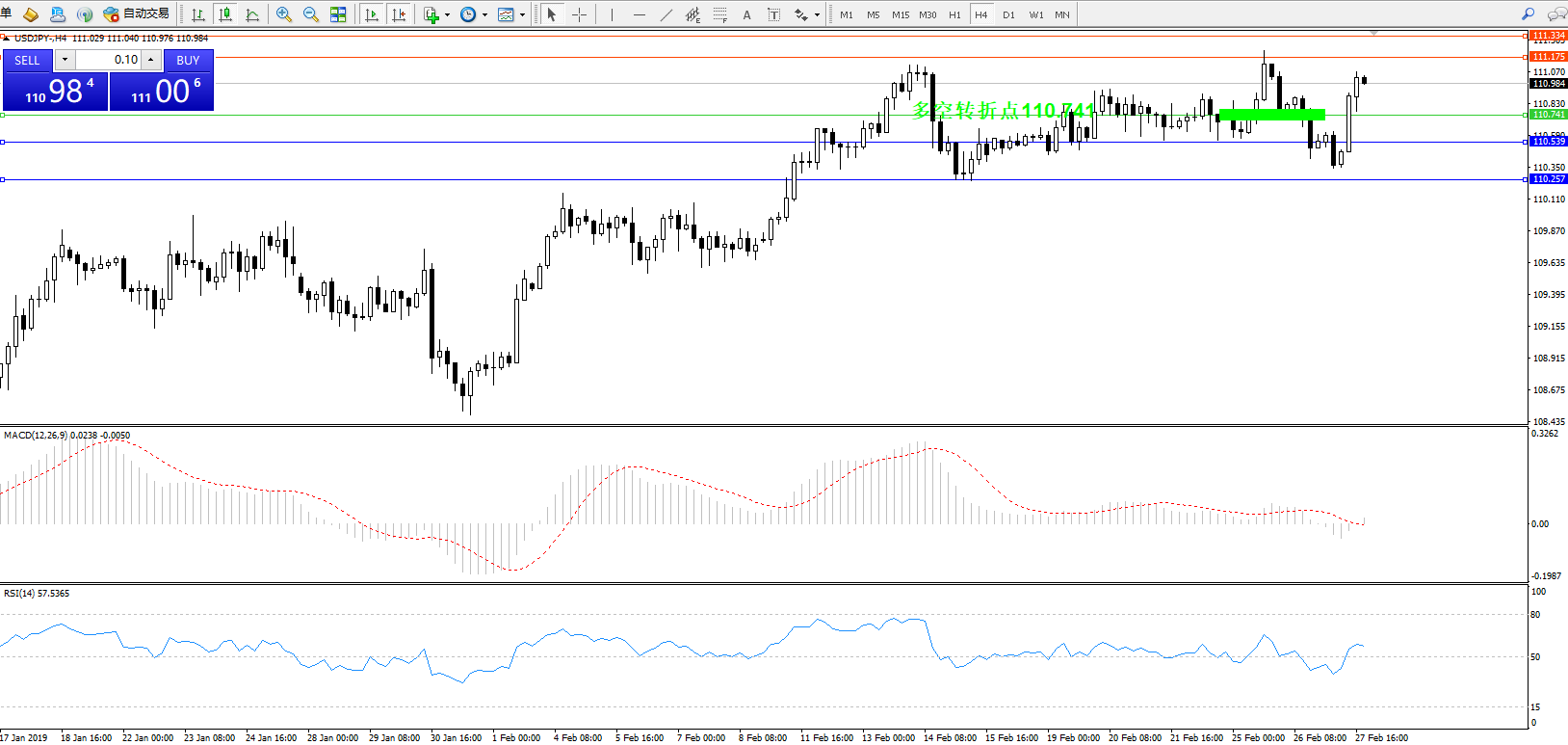 美元疲软令日元受益,推动日元重新走强的原因在于全球风险情绪重新面临恶化。国际金融市场避险情绪在周三亚市尾盘再度升温,因巴基斯坦官方严词回应印度军机空袭巴境内目标事件,称已击落一架印度军机并俘获飞行员,导致双边局势更加趋紧。周四美国总统特朗普与朝鲜领导人金正恩的会晤若传出积极结果,日元强势有望再受遏制。而同时,若美国经济数据仍然低迷,配合美联储主席鲍威尔周三的进一步把鸽派讲话,或令美元进一步承压,并推动美元兑日元下破关键支撑。