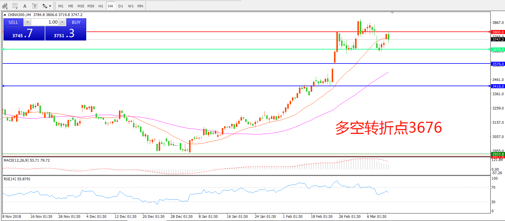 4小时图看,CHINA300中华指数高位出现震荡,连续反弹至3800点后稍有回落,整体形态依然偏多,均线系统呈多头排列, MACD红柱缩减,日内震荡上升概率较大。