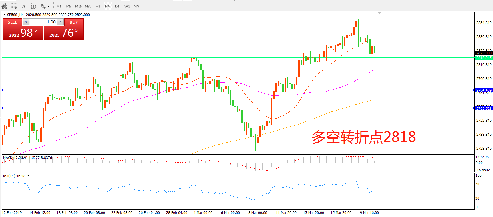 3月20日周三,美联储会后公布的声明显示,全体美联储货币政策委员会FOMC成员一致投票同意,保持 2.25%-2.5%的联邦基金利率目标区间不变,多数联储官员的预期今年加息次数从两次降至零,令市场十分意外。美联储主席鲍威尔表示美联储将保持耐心,并保持观望状态,希望维护美国经济强劲增长的前景,美股在FOMC公布利率决议后一度集体转涨,最终标普500指数收跌8.34点,报2824.23点。