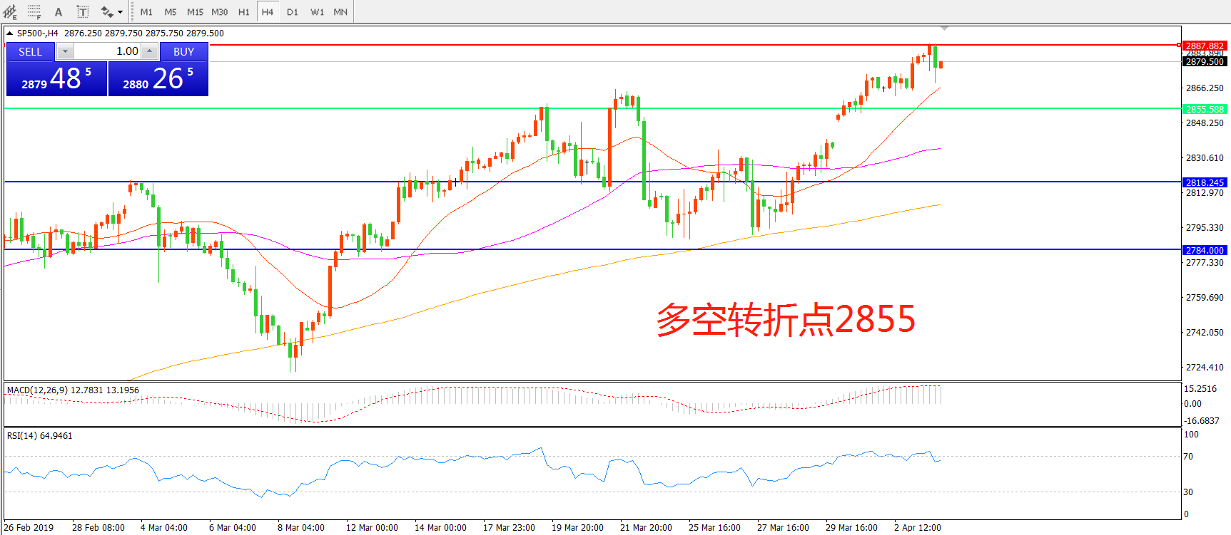 4小时图看,标普500突破2855后以小幅震荡为主,均线系统呈现多头排列, MACD红柱增加,RSI指标走平,日内走势震荡偏多。