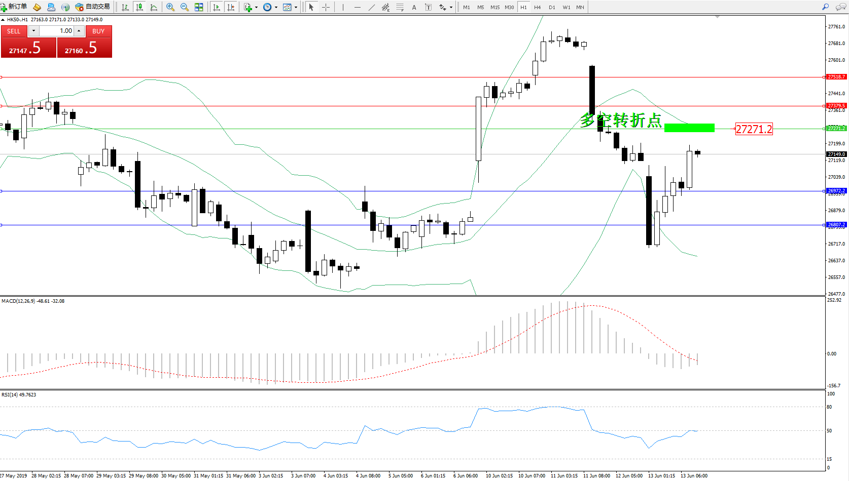 恒指HK50 ——1小时K线图显示: