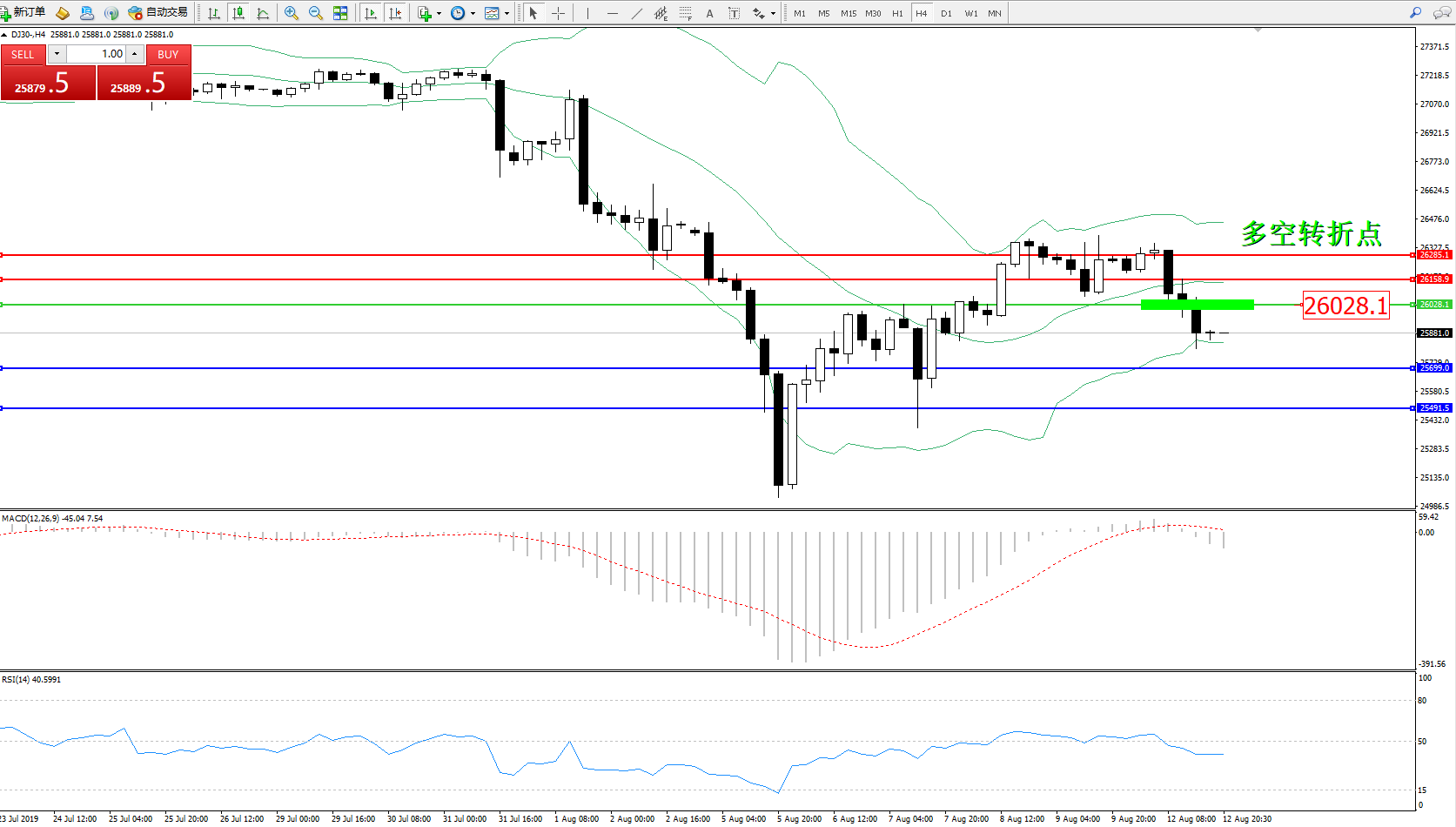 道琼斯指数8月12日(周一)收盘下跌391.00点,跌幅1.49%,报25896.44点。倒挂的美债收益率在强化美国经济料陷入衰退的预期,也强化了美联储进一步宽松的预期,施压道指,摩根士丹利表示,将2019年底美国10年期国债收益率预期下调至1.60%,市场将预期美联储在2020年降息3-4次。贸易紧张局势的发展影响大于预期,将下调美国第四季度的经济增长预期20个基点到1.8%。