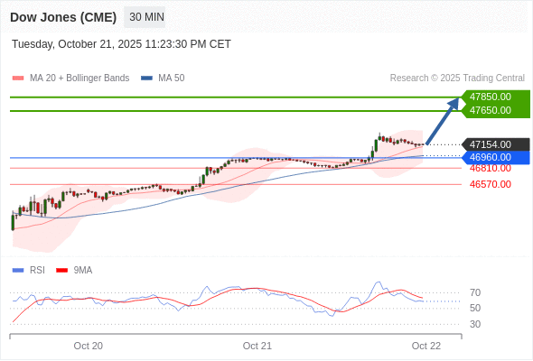 在 46960.00 之上,看涨,目标价位为 47650.00 ,然后为 47850.00 。