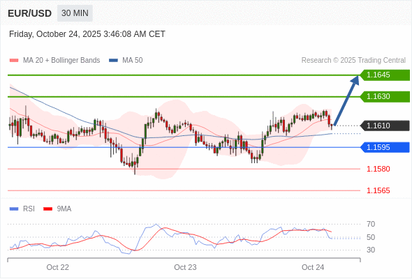 在 1.1595 之上,看涨,目标价位为 1.1630 ,然后为 1.1645 。