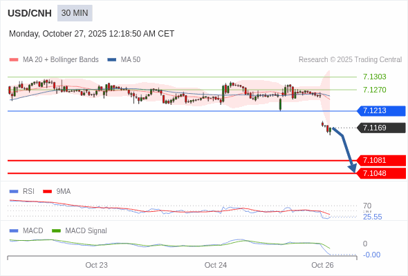 技术点评: RSI技术指标小于30。在这种情况下,说明有很强的下跌趋势,或者意味着处在超卖的状态下,可能会有向上的反弹。我们将观察RSI技术指标是否出现背离现象。 MACD技术指标处在其信号线之下看空。 配置为负。 此外,价位低于其20天及50天移动平均线 ( 分别位于7.1244 和7.1253 )。
