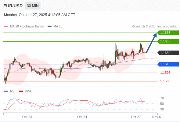 在 1.1610 之上,看涨,目标价位为 1.1650 ,然后为 1.1665 。