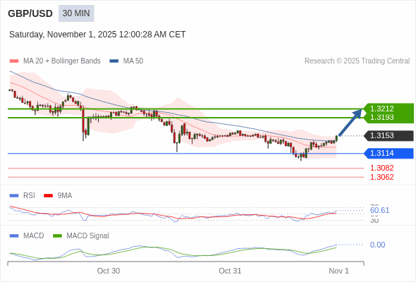 英镑/美元 当日内 : 看涨,当 1.3114 为支撑位。