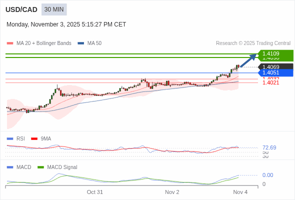 技术点评: RSI技术指标大于70。在这种情况下,说明有很强的上升趋势,或者意味着处在超买的状态下,可能会有向下的调整。我们将观察RSI技术指标是否出现背离现象。 MACD技术指标处在其信号线之上看多。 配置为正。 此外,价位高于其20天及50天移动平均线 ( 分别位于1.4041 和1.4025 )。