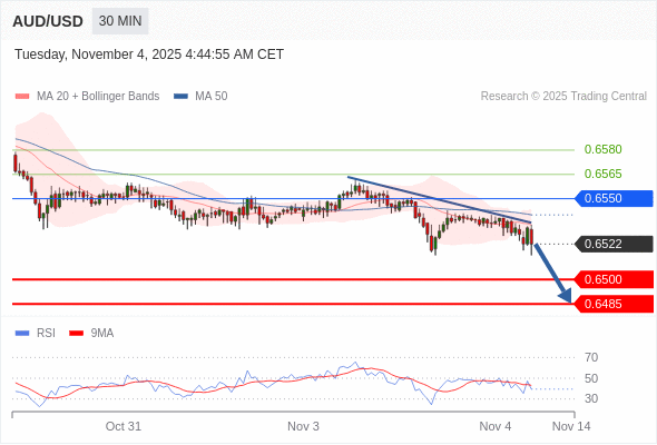 在 0.6550 之下,看跌,目标价位为 0.6500 ,然后为 0.6485 。