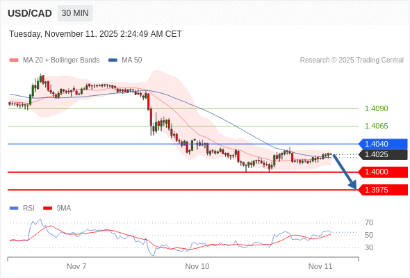 在 1.4040 之下,看跌,目标价位为 1.4000 ,然后为 1.3975 。