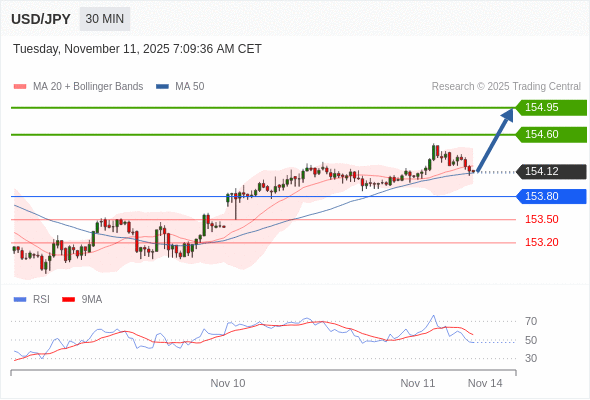 在 153.80 之上,看涨,目标价位为 154.60 ,然后为 154.95 。