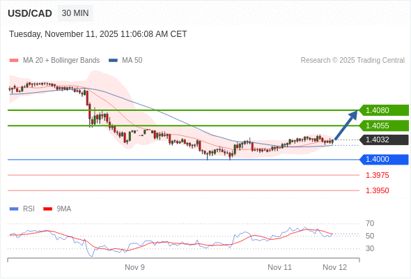 在 1.4000 之上,看涨,目标价位为 1.4055 ,然后为 1.4080 。