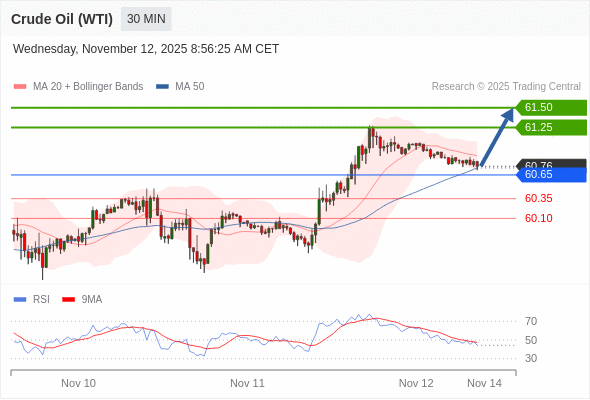 在 60.65 之上,看涨,目标价位为 61.25 ,然后为 61.50 。