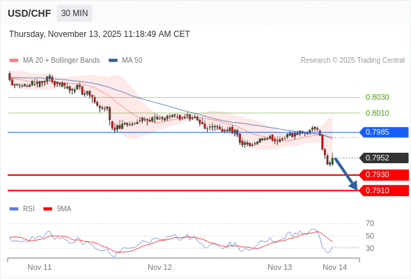 在 0.7985 之下,看跌,目标价位为 0.7930 ,然后为 0.7910 。