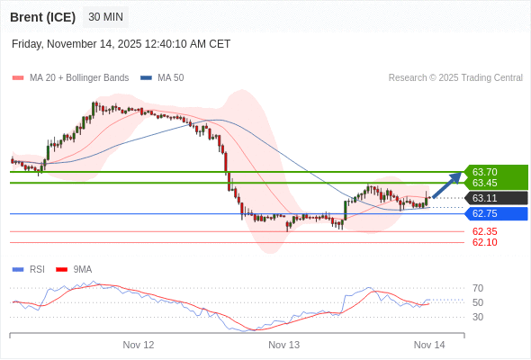 在 62.75 之上,看涨,目标价位为 63.45 ,然后为 63.70 。