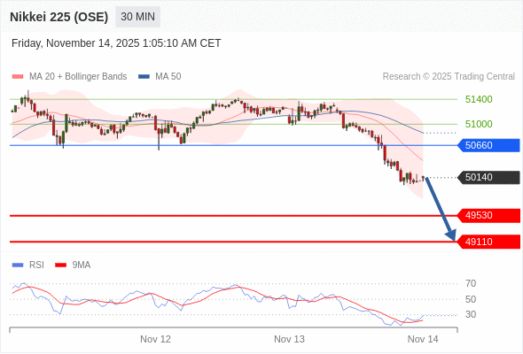 交易策略: 在 50660 之下,看跌,目标价位为 49530 ,然后为 49110 。