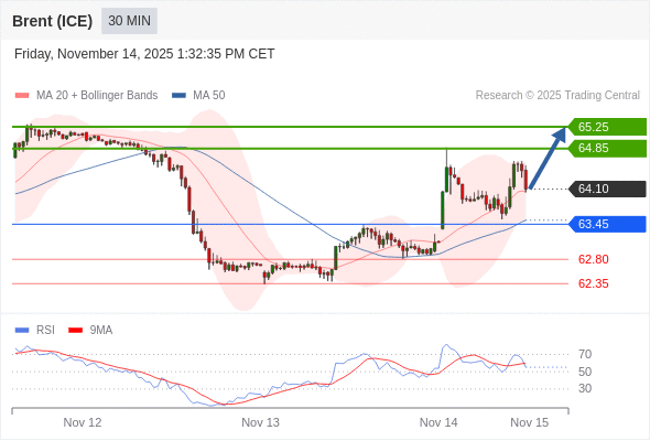在 63.45 之上,看涨,目标价位为 64.85 ,然后为 65.25 。