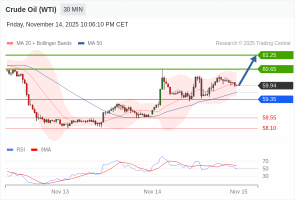 在 59.35 之上,看涨,目标价位为 60.65 ,然后为 61.25 。