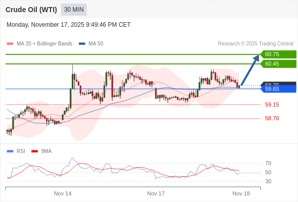 在 59.65 之上,看涨,目标价位为 60.45 ,然后为 60.75 。