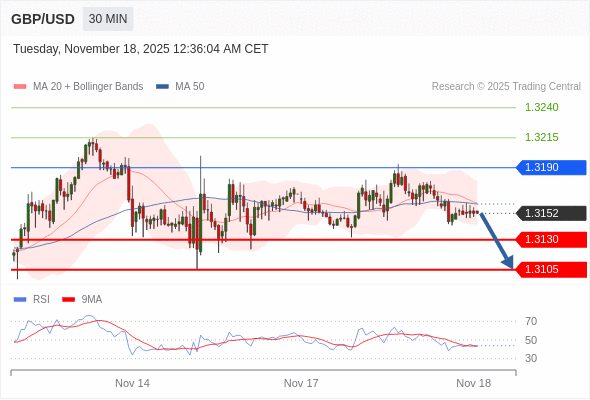 在 1.3190 之下,看跌,目标价位为 1.3130 ,然后为 1.3105 。