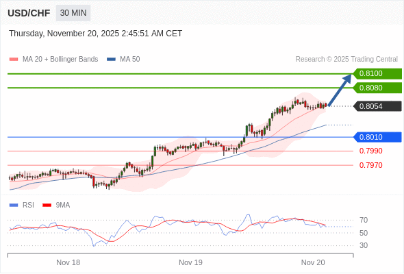 在 0.8010 之上,看涨,目标价位为 0.8080 ,然后为 0.8100 。