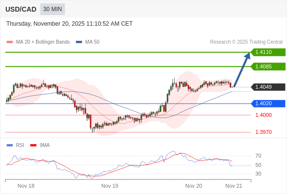 在 1.4020 之上,看涨,目标价位为 1.4085 ,然后为 1.4110 。