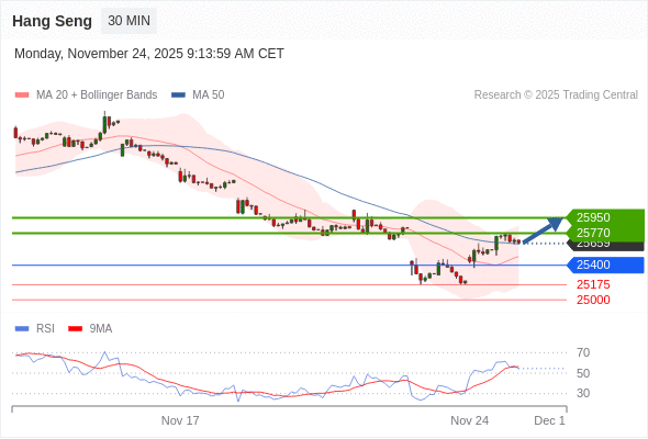 在 25400 之上,看涨,目标价位为 25770 ,然后为 25950 。
