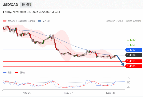 美元/加元 当日内: 短期关键阻力位在1.4050。