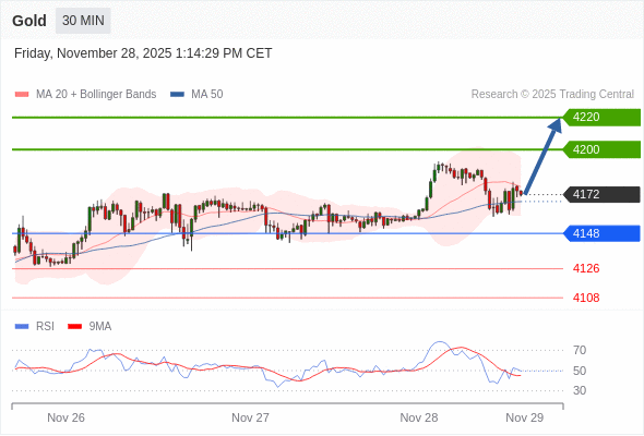 在 4148 之上,看涨,目标价位为 4200 ,然后为 4220 。