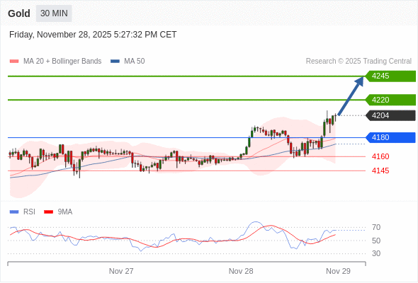 在 4180 之上,看涨,目标价位为 4220 ,然后为 4245 。