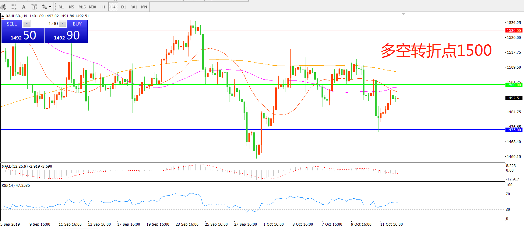 周一(10月14日),中美协议“接近达成”打压市场中的避险情绪,金价跌至1475美元附近后震荡企稳,但英国硬脱欧等诸多事件依然成为金价有力支撑。现货金价小幅反弹后收报1492.69美元/盎司,维持在1500美元下方波动,市场在等待更多消息指引,本周重点关注周四和周五的欧盟峰会。