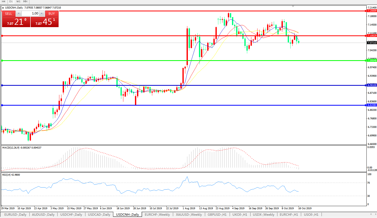 技术面简析:日图短期均线呈空头排列,汇价7.10关口承压下行,MACD快速逼近0轴且量能0轴下方放量,RSI持续小走低,预计短期汇价将延续宽幅整理态势,汇价运行于7.00-7.10区间的概率较大;中美贸易后续谈判进展将决定汇价最终趋势。