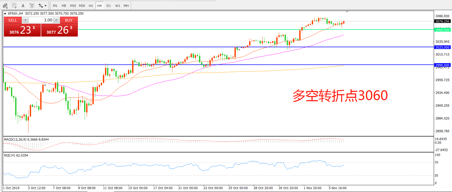 4小时图看,标普500维持高位震荡,整体走势偏强,回踩3060支撑之后上行趋势较为明显,均线系统呈多头排列,MACD红柱减少,RSI指标向上,日内延续上行概率较大。