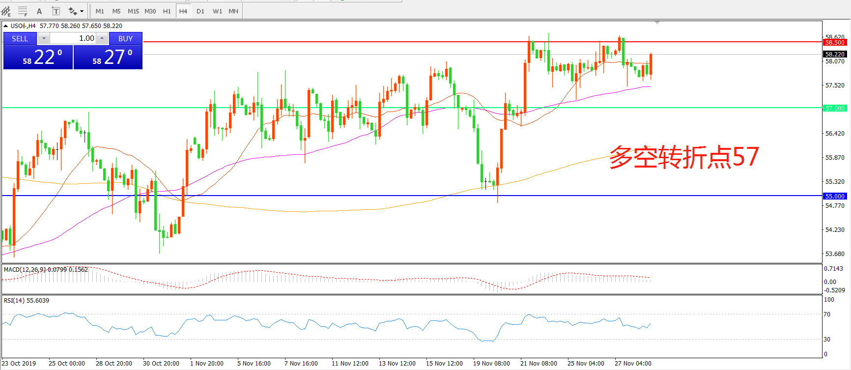4小时图看,油价触碰58.5一线后再次回落,显示上方阻力较强,55周期均线成为下方支撑,整体仍处于上行趋势,MACD红柱缩短,RSI指标向上,日内仍以多头思路对待。
