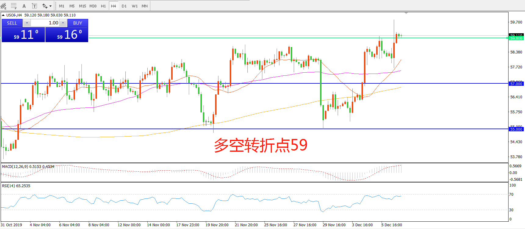 4小时图看,油价阳线连续拉升,长阳突破58.5附近阻力,整体走势偏多,均线系统走平,MACD红柱增加,RSI指标走平,日内延续上行概率较大。