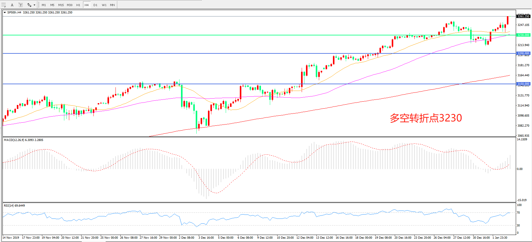 周四(1月2日)中国央行降准引发投资者对于全球央行进一步执行宽松货币政策的预期,美股全线收涨,标普500指数高开高走,收报3261.25点。美国总统特朗普周二表示,他将于1月15日在白宫签署国际贸易协议,并参加在更晚一些时间开始的新阶段谈判,后续仍需重点关注中美贸易谈判进展。科技股表现抢眼,FAANG五巨头中,苹果涨2.28%,股价首次突破300美元,再创历史新高,中概股集体发力,如涵涨幅超过23%,哔哩哔哩涨12.51%。
