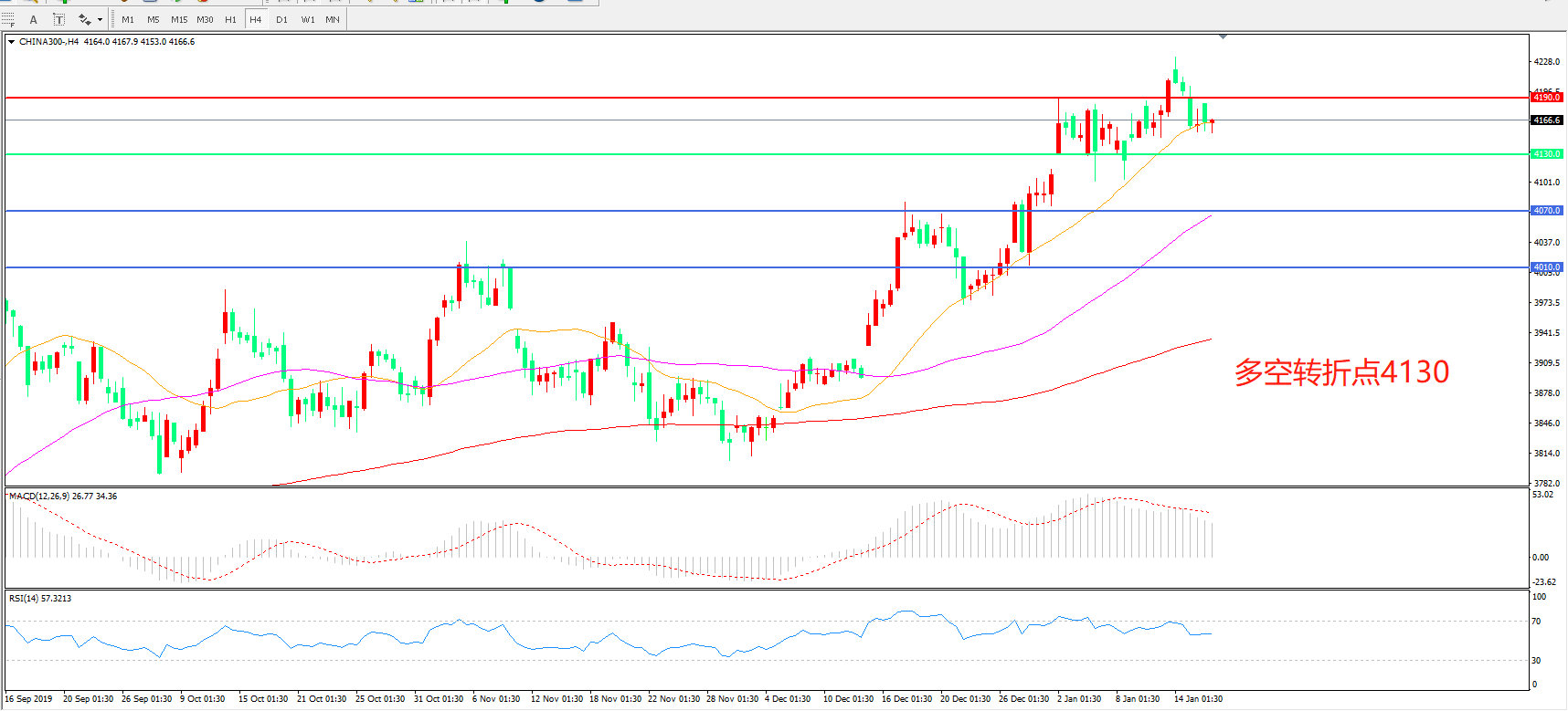 4小时图看, 沪深300维持高位震荡,短期走上并不明朗,均线系统呈多头排列,MACD红柱减少,RSI指标走平,日内震荡上行概率较大。