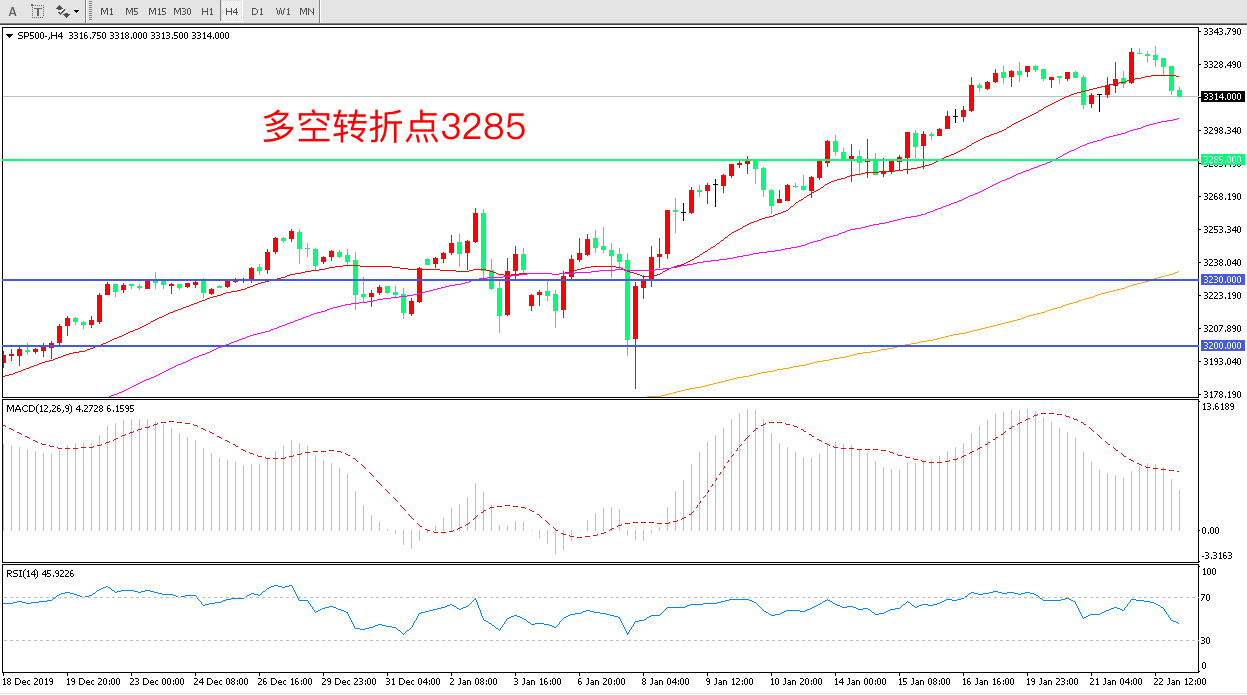 4小时图看,标普500冲高回落,涨势受阻,均线系统有拐头迹象,MACD红柱减少,RSI指标向下,日内延续震荡概率较大。
