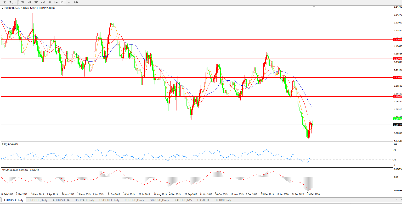 三菱日联银行(MUFG)周一(2月24日)发布研究报告指出,欧元兑美元短线走势维持看空,若跌破1.0750将进一步下看1.04-1.05区间; 欧元近期存在进一步的下行空间。欧元区PMI调查显示企业信心适度改善,这令欧元跌势有所缓解;同时疫情带来的影响暂时依然有限,但我们不认为当前的数据反弹能够持续;汇价目前正在靠近长期关键支撑1.0750附近,若明确跌破此处将打开下探1.04至1.05区间的大门,即2016年末至2017年初的交投区间。