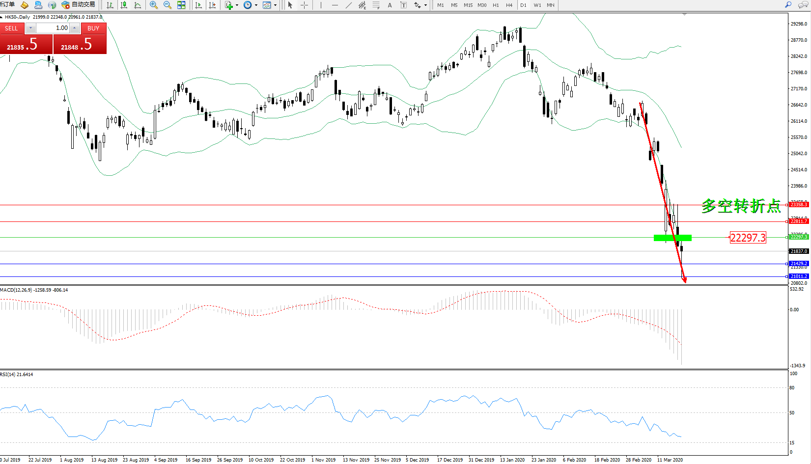 香港恒生指数3月19日(周四)收盘下跌582.69点,跌幅2.61%,报21709.13点;港股市场整体现大跌行情,主要股指大幅探底后跌幅开始收窄。上午盘开盘后现单边下跌行情,恒指一度大跌超5%下挫超千点。随着市场情绪转好,午后震荡回升。但外围疫情仍旧持续恶化,时刻影响市场走向。主板成交量为1910.53亿港元,港股通大幅净流入167.1亿港元。股、债券、商品甚至黄金都在抛售加剧,说明流动性危机——金融危机的前兆已经出现,要做好应对金融危机的准备,疫情全球大流行只是导火索,根源是全球经济、金融、社会的脆弱性。