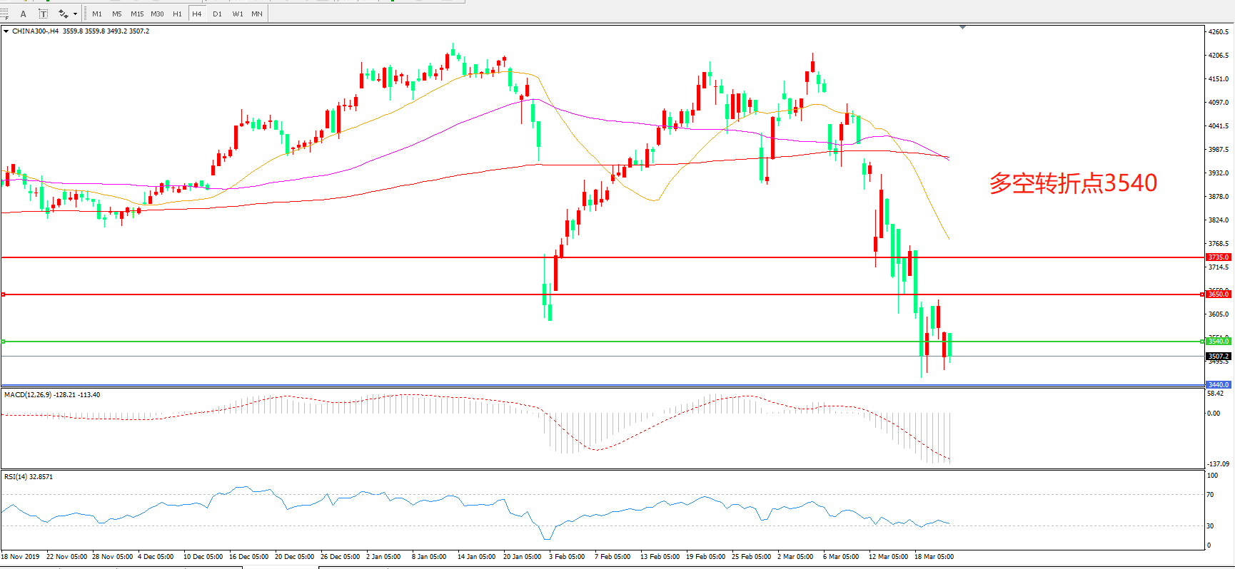 4小时图看,沪深300延续低位震荡,整体表现低迷,均线系统呈空头排列,MACD绿柱增加,RSI指标走平,日内延续下行概率较大。
