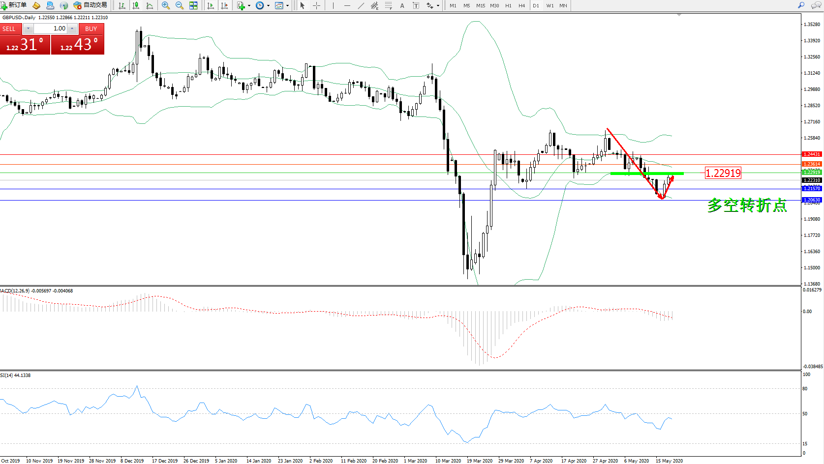 交易策略:1.22919下方看跌,目标1.21570、1.20630