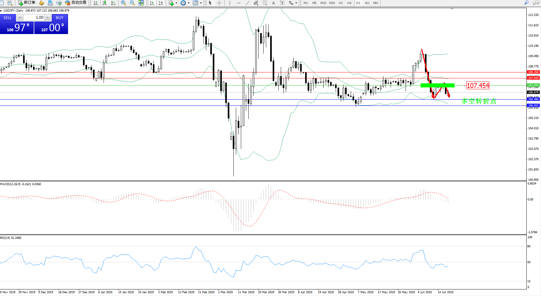 技术点评:空头空头高位急速下挫后,触及布林带指标下轨附近得到支撑开始维持在中下轨区间弱势震荡平移中,布林带指标呈张口走势持续中,空头动力有继续下行态势,MACD指标空头动力震荡下行破0轴线后维持在空头区域弱势向下移动中,RSI指标处于50均衡线下方弱势整理向下移动中;