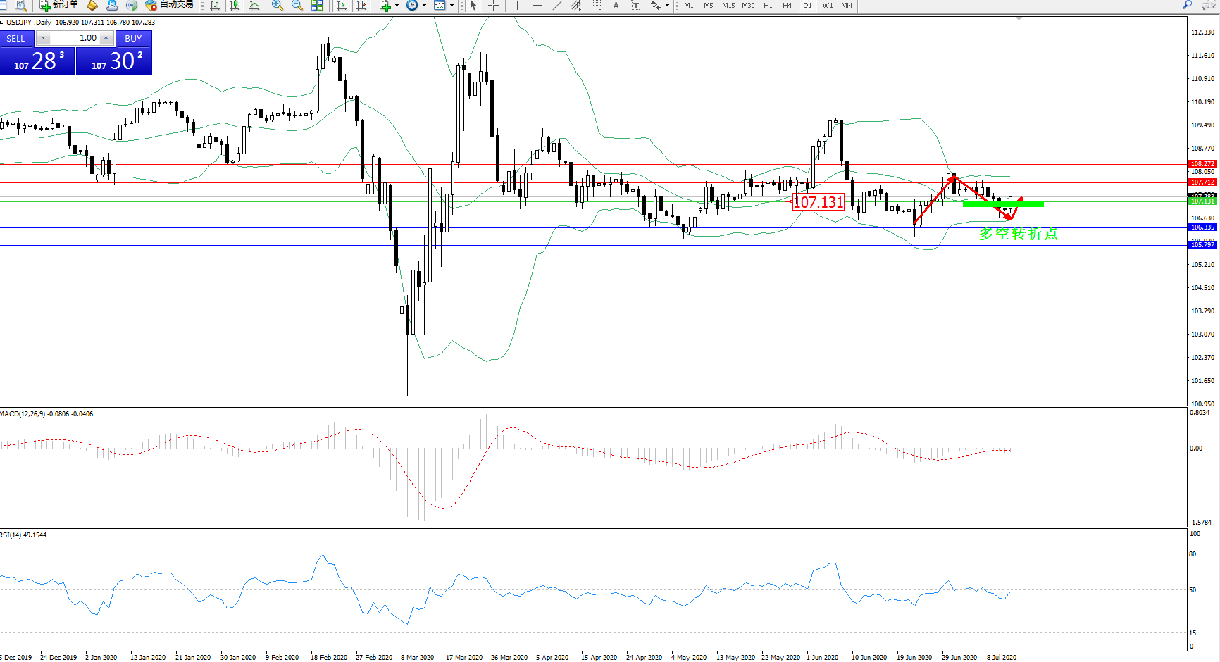 美元兑日元上涨0.34%至107.29,盘中低点106.79,野村证券讨论了对本周日本央行和欧洲央行7月利率决议的预期,日元走强的空间有限,预计美元兑日元将逐渐升向110及以上点位,日本央行和欧洲央行料均维持观望立场,以评估之前宽松措施的影响;在717-18日的欧盟峰会上,欧盟复苏基金的讨论对欧元兑日元走势的影响将更为关键,如果达成协议那将是一个惊喜,尽管协议更有可能被推迟到7月底,不过只要有关该基金的讨论继续进行,欧元区外围国家的政府债券和欧元兑日元仍可能获得支撑。此外,三菱东京日联银行表示,日本央行7月决议料维稳,关注黑田新闻发布会。受美元后市料将持续承压,全球资金配置方向出现转移影响,美元兑日元将打开进一步下行空间,未来数周间或进一步下探至106.20这一支撑位水平。