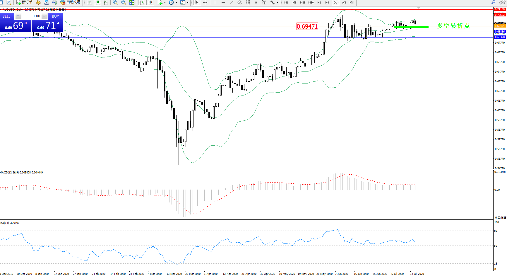 交易策略:0.69471上方看涨,目标0.70622、0.71198