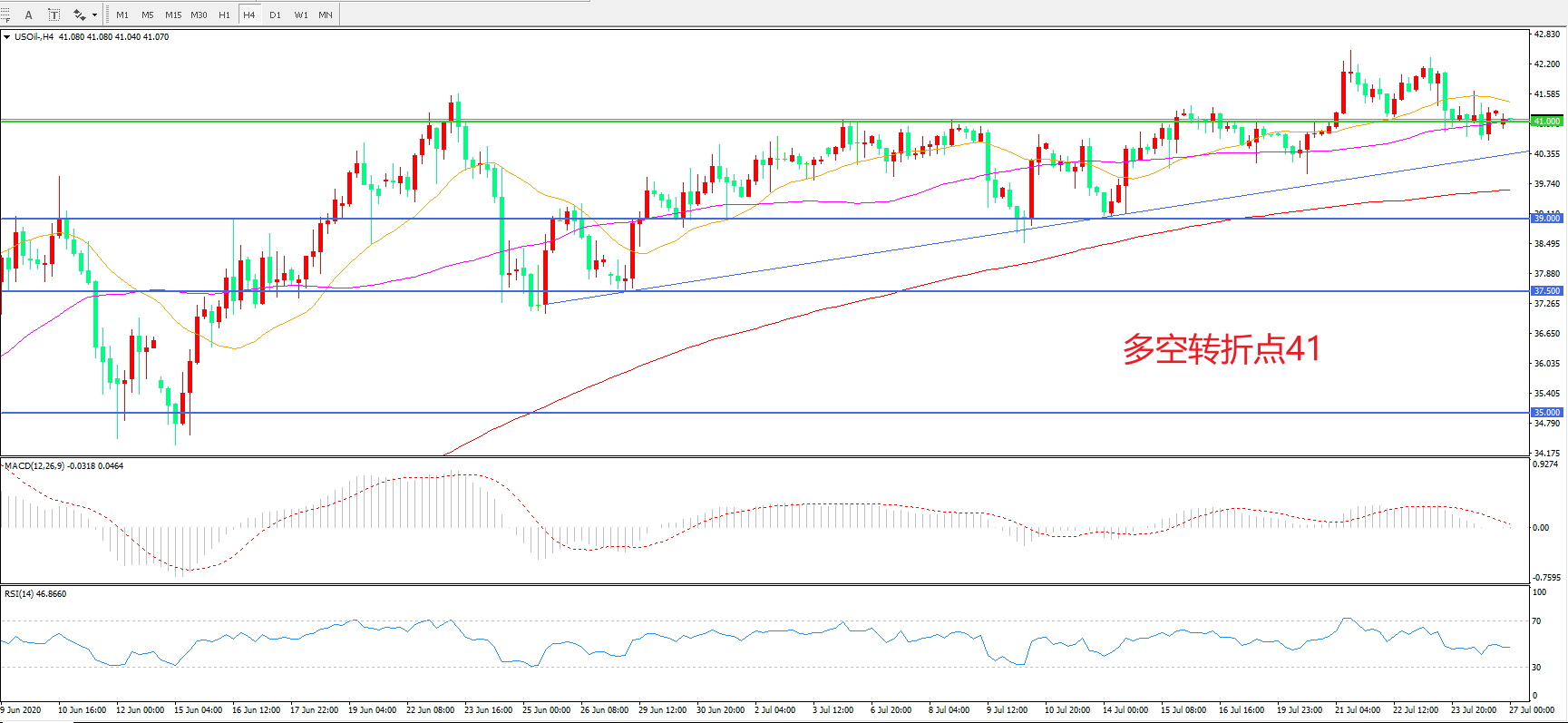 4小时图看,油价先跌后涨,短期波幅有所扩大,41美元成为短期多空分水岭,MACD红柱增加,RSI指标走平,日内延续上行概率较大。