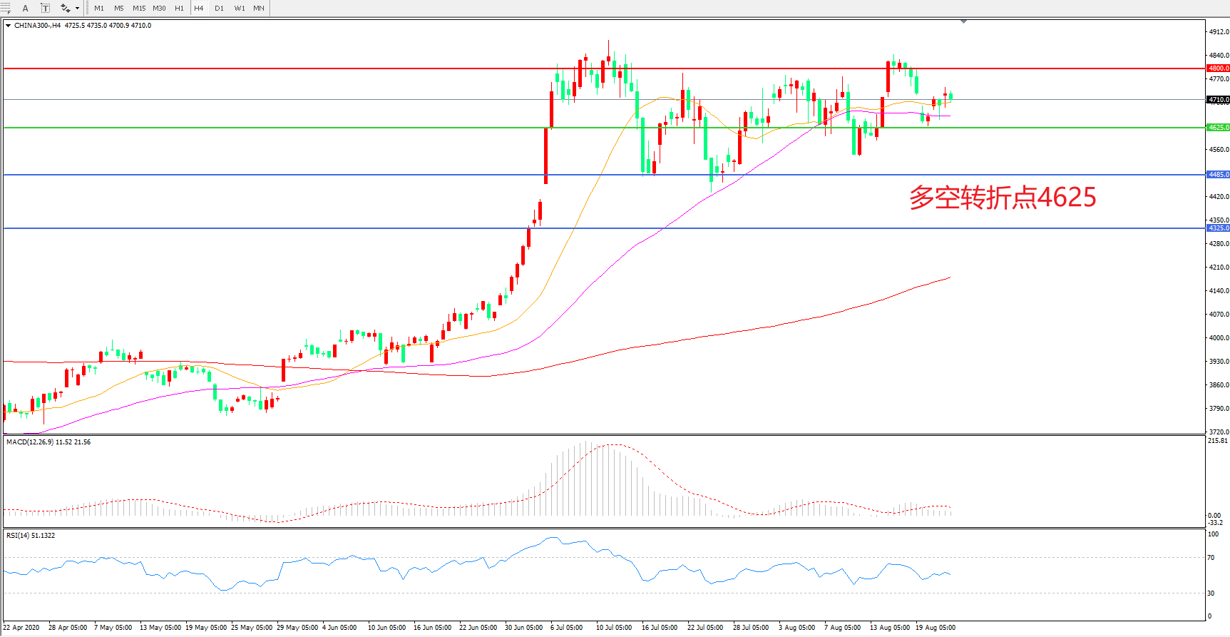 4小时图看,沪深300延续宽幅震荡,整体表现相对低迷,4625成为短期支撑,4800成为上方阻力,均线系统走平, MACD红柱缩短,RSI指标向上,日内延续震荡概率较大。