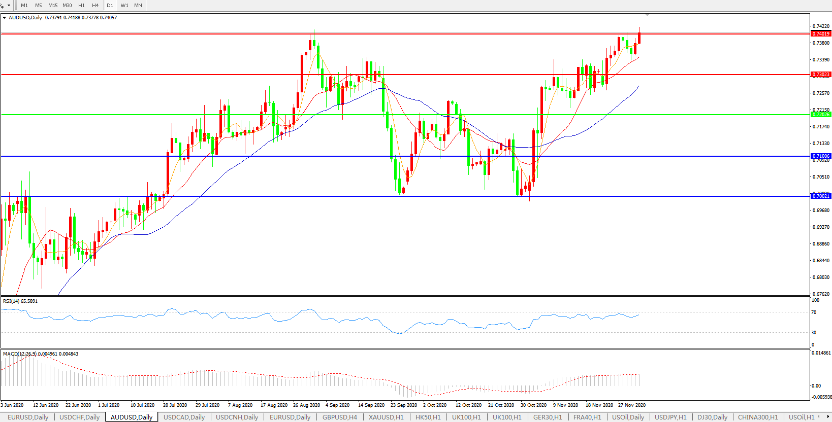 澳元兑美元在周三日内陷入横盘震荡走势,数度试图重新上攻0.74关口而无果,虽然日内稍早澳洲GDP数据表现整体令人满意,但是分项数据却显示在就业等领域隐忧犹存,这令汇价上行空间受到限制。与此同时,澳洲当前面临的贸易环境困境也令澳元汇价无法继续保持之前的强势;如此背景下,在本周一见高回落后,澳元汇价再度上行攻击前期高位0.7414的尝试依旧无功而返,这也使得0.74关口及上方的阻力变得益发沉重。而日线RSI指标也指向汇价上行动能已趋向于衰竭,后市更可能面临进一步的回调,下方支撑下看11月19日的低点0.7255,以及55日均线切入位0.7198;反之,一旦后市有更多风险利多消息带动商品系货币走强,推动澳元升破年内前高,则之前澳元汇价自0.8136跌至0.5510这波趋势的78.6%回撤位,约在0.7574处,将成为汇价的下一步征服目标澳元兑美元在澳洲贸易账数据大幅向好之后不涨反跌,回撤至0.74关口。