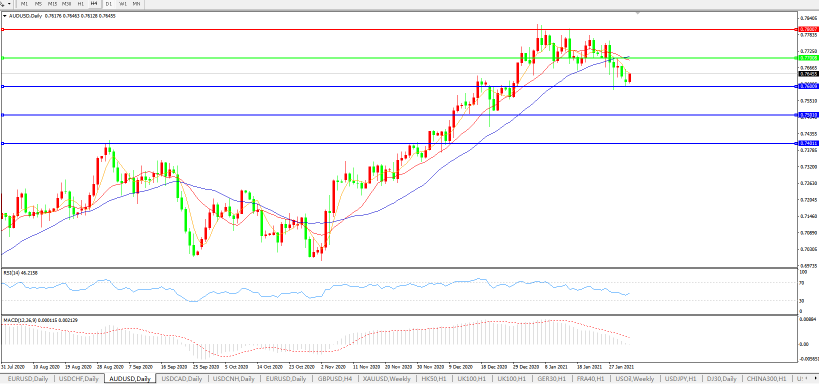 交易策略:0.7700下方看跌,目标0.7600、0.7500