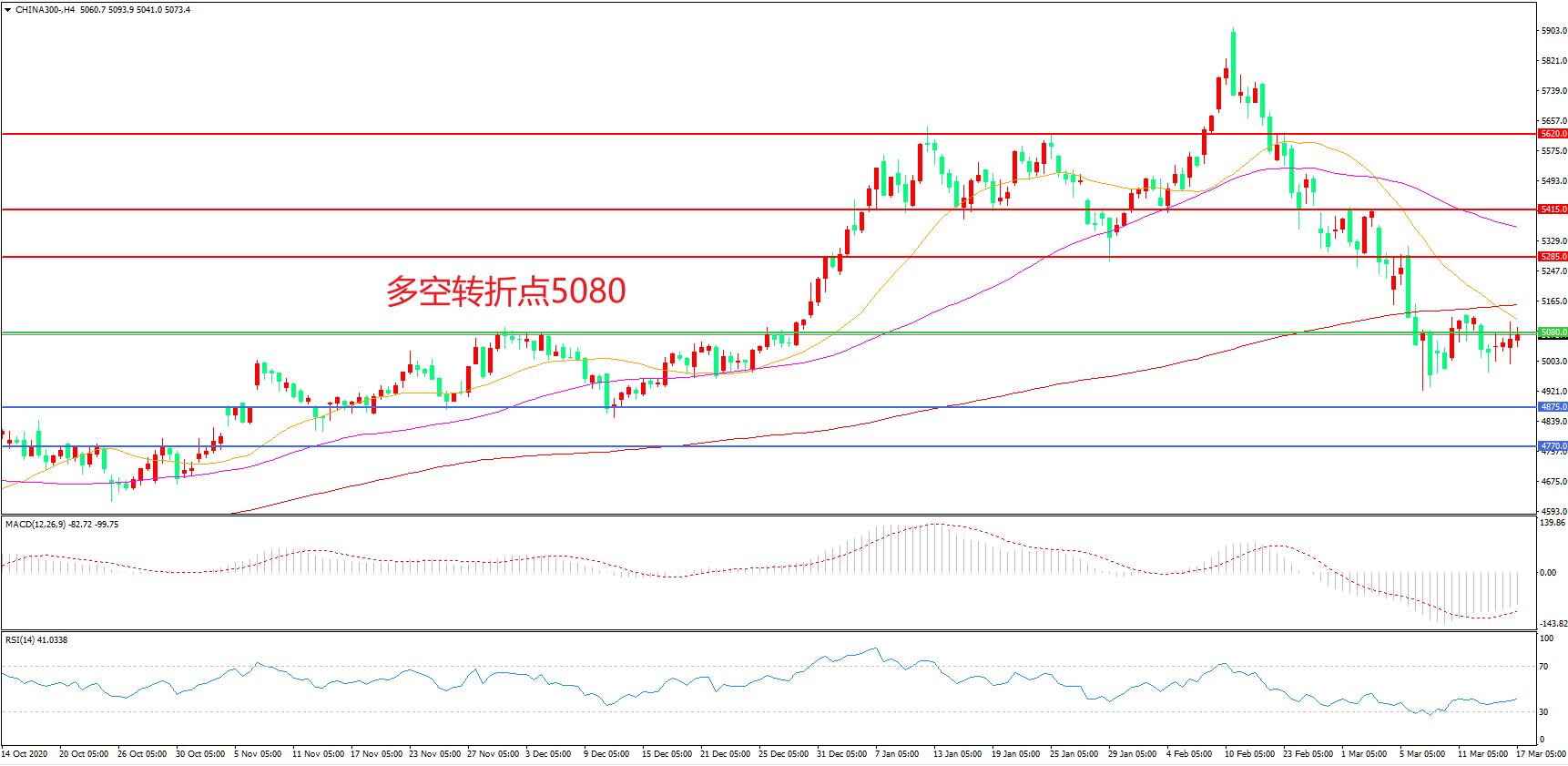4小时图看,沪深300延续低位震荡,整体波幅不大,200周期均线成为上方阻力,21周期均线出现下穿,MACD绿柱增加,RSI指标走平,日内延续震荡概率较大。